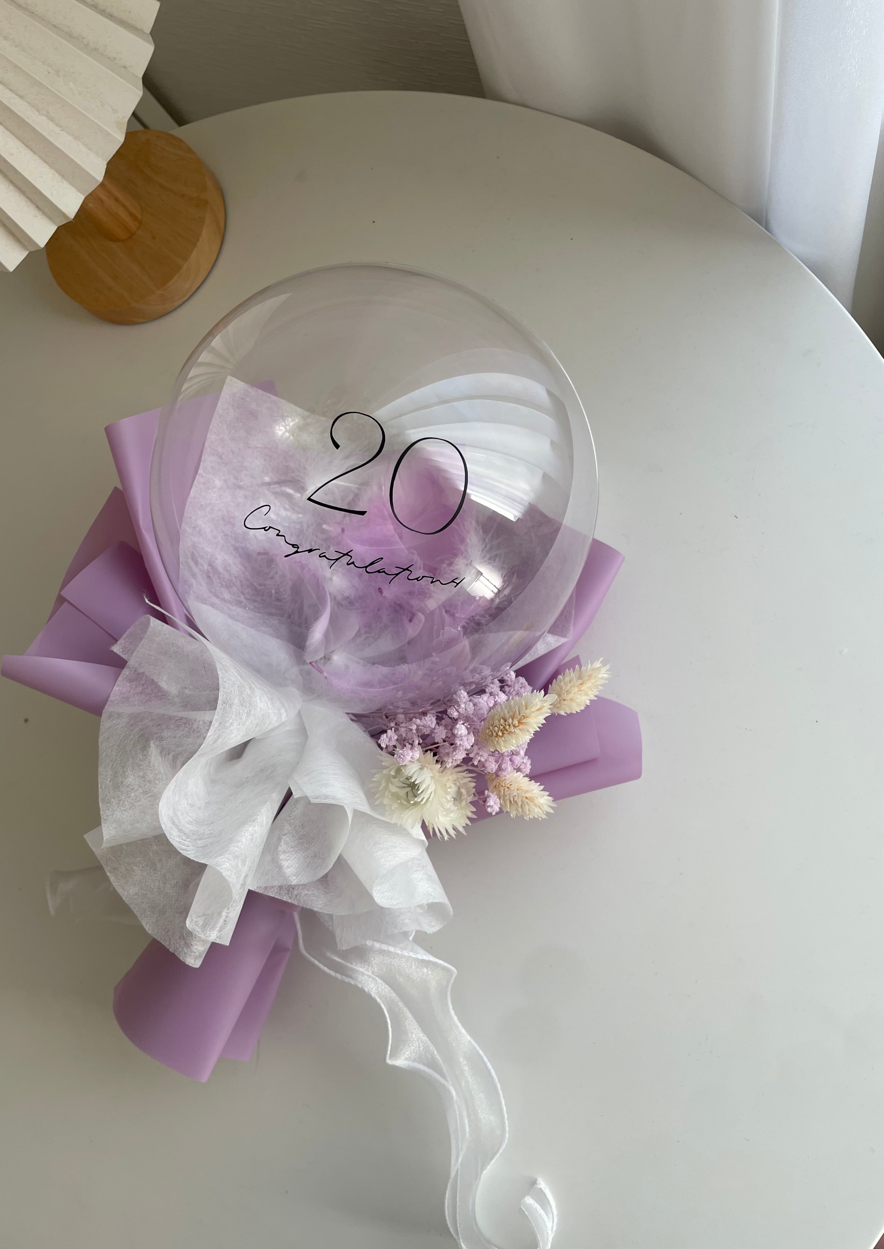 透明なバルーンにふわふわな羽根をお入れし、ドライフラワーのミニブーケをお付けしたバルーンブーケです♡