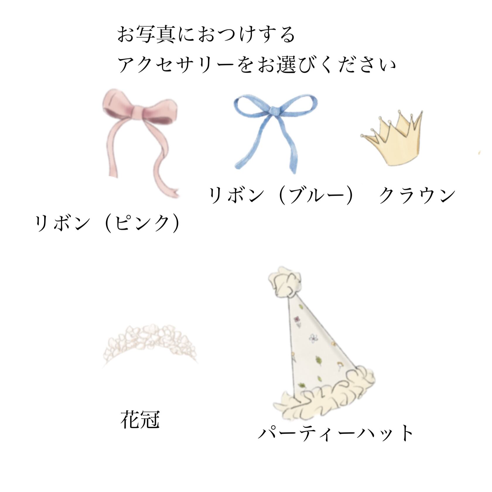 リボンや王冠などのアクセサリーを自由にお選びいただけます。